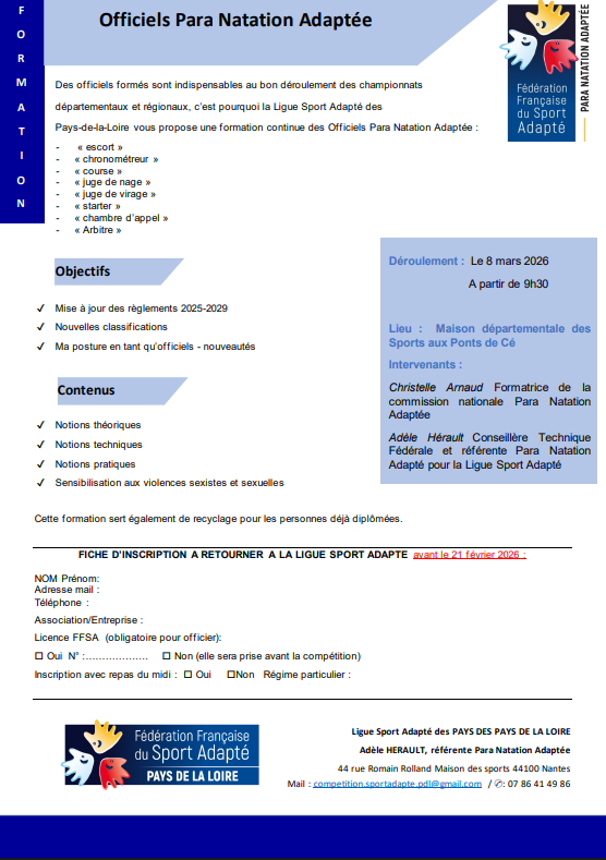 Une formation d’officiel para natation adapté proposée le 8 mars 2026 le matin du championnat inter-régional de para natation adapté. Des officiels formés sont indispensables au bon déroulement des championnats départementaux et régionaux, c’est pourquoi la Ligue Sport Adapté des Pays-de-la-Loire vous propose une formation Officiels Para Natation Adaptée. Cette formation sert également de recyclage pour les personnes déjà diplômées.