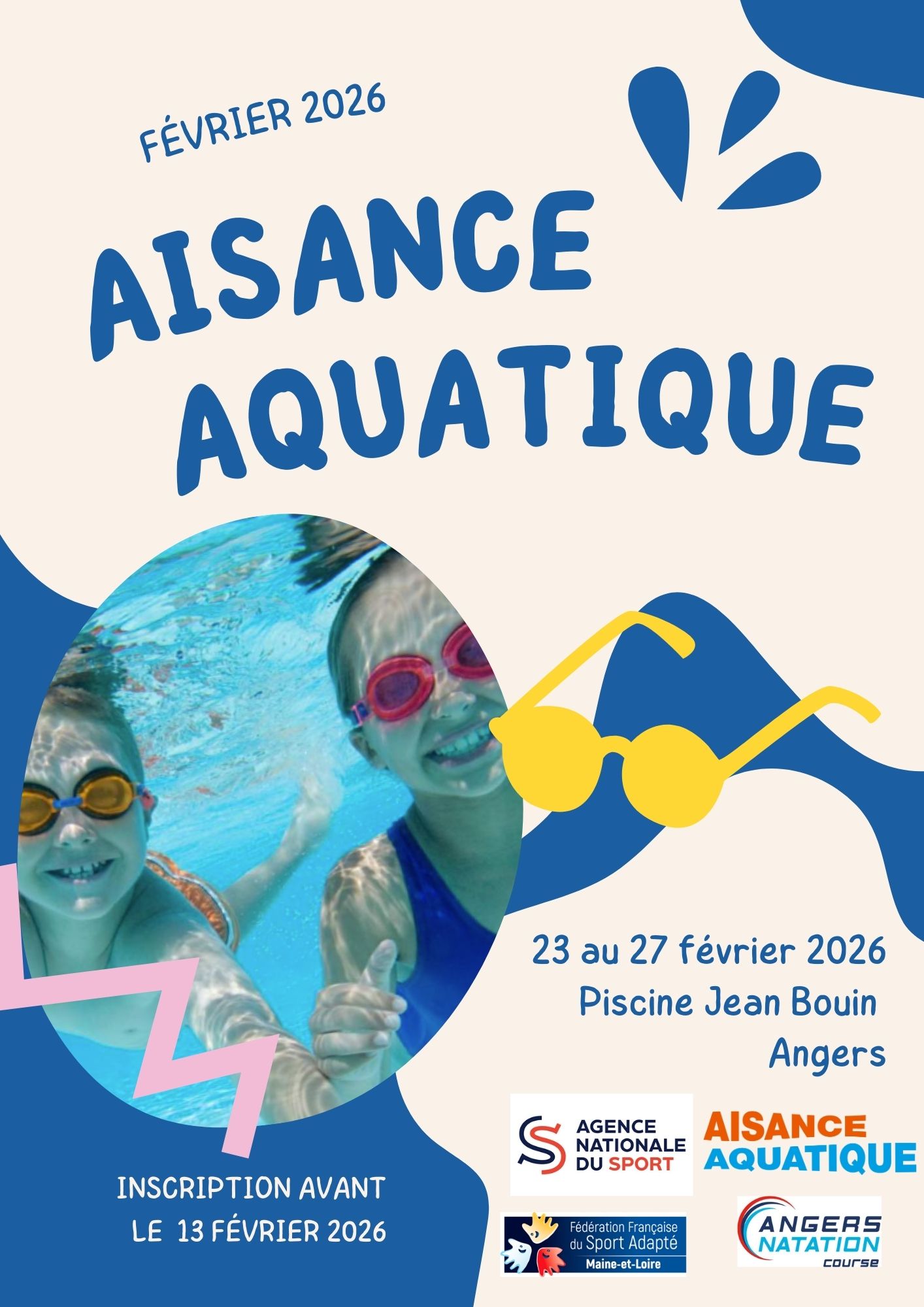 Le CDSA 49, en partenariat avec Angers Natation, vous propose un stage d’Aisance Aquatique du 23 au 27 février 2026!
